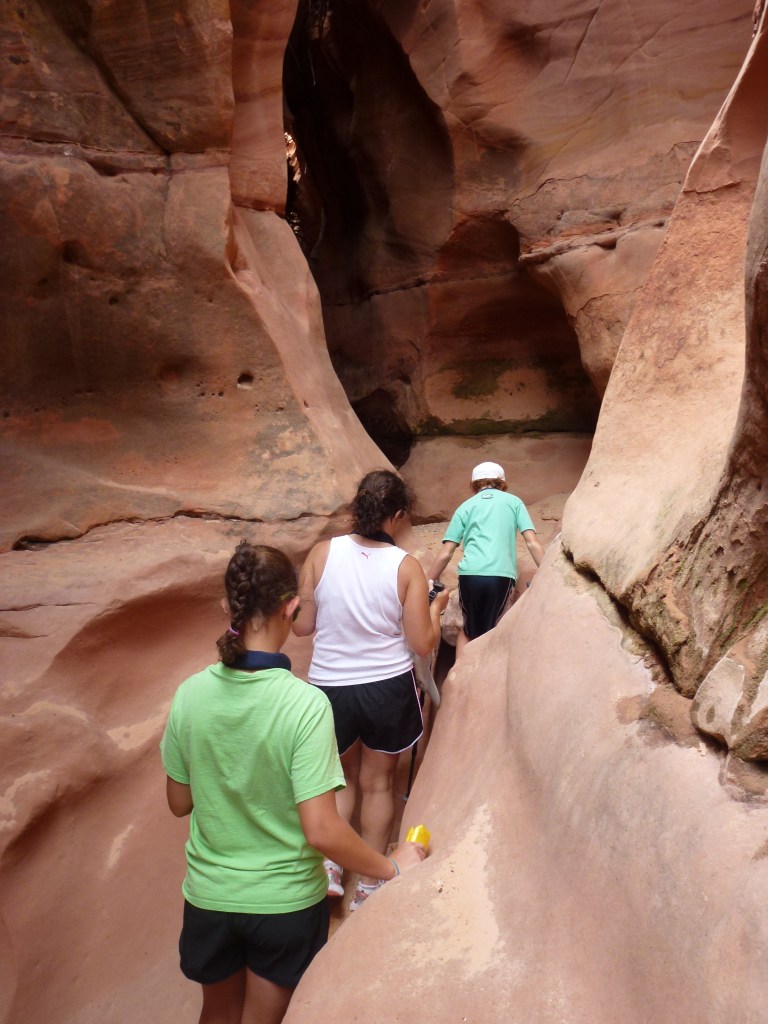 We unloaded our gear and made our way to the slot canyon about a mile from our campsite. It was significantly cooler once we entered it, since the narrow rock walls held moisture and a lower temperature than the sun baked fields above us. The goats, unencumbered by the packs, moved with even more agility and speed. They were excellent hiking buddies. The slot canyon required us to climb up and over boulders, some the size of a small SUV, and squeeze through narrow passages. We would reach a point and look at one another, wondering how the goats would manage and before we could even pose the question, alley-oop, they were up and over, or under and through. It was truly astonishing.