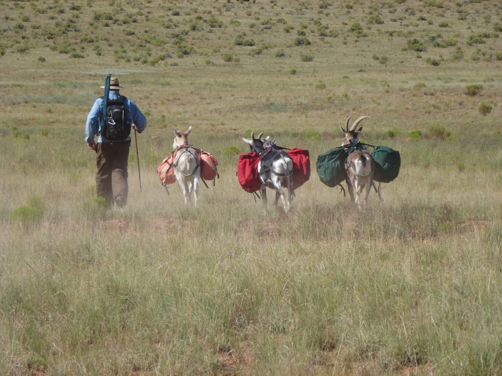 We arrived at our starting point and the goats clearly knew it. They were clattering around in the truck bed, anxious to offload and move. In fact, as soon as Willy ambled down the ramp, he took off at full tilt through the scrub. None of us will forget Shawn dropping everything and running after spirited Willy, a true salute to the saying “shake your willies out”! The goats carried side panniers that held our camping gear, cookware, food, water and even our clothes and personal items. We helped Shawn strap the saddle bags on each of the goats and we began to get acquainted with them. They were docile and friendly. We found they liked attention and we could pet them just like our spaniel at home. They each had a unique personality, markings, and appearance. Our favorite ended up being Elvis, who had a remarkable and severe underbite which gave him a homely but irresistibly endearing look.